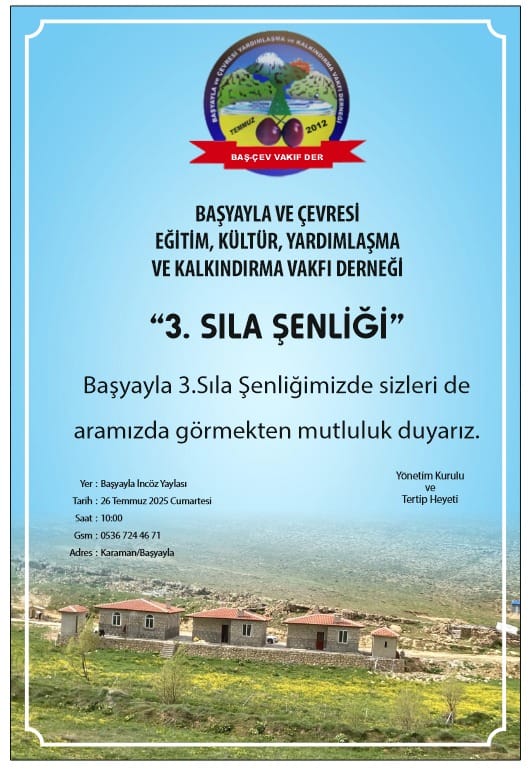 Başyayla ve Çevresi Yardımlaşma ve Kalkındırma Dayanışma Vakfı Derneği (Başyaylalılar Derneği), yurt içinden ve yurt dışından gelen tüm hemşehrileri 3. Sıla Şenliği‘ne davet ediyor.