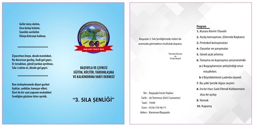 3. Sıla Şenliği, 26 Temmuz 2025 Cumartesi günü yapılacak. Saat 10:00’da Başyayla İncöz Yaylası’nda gerçekleşecek.